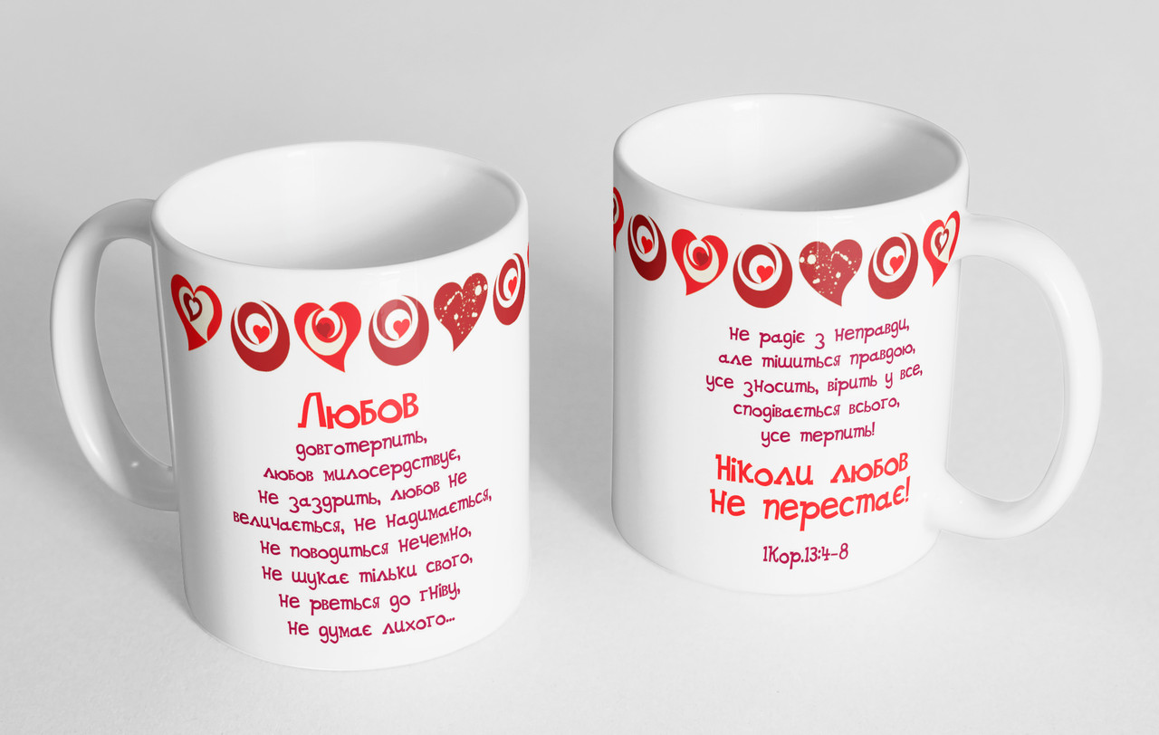 Напис: «Любов довготерпить, любов милосердствує, не заздрить, любов не величається, не надимається, не поводиться нечемно, не шукає тільки свого, не рветься до гніву, не думає лихого… не радіє з неправди, але тішиться правдою, усе зносить, вірить у все, сподівається всього, усе терпить! Любов ніколи не перестає!» (1Кор. 13:4-8).